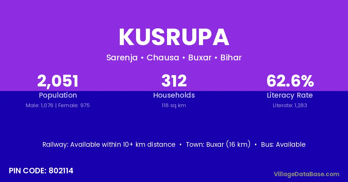 Buxar (16 km) is the nearest town to Kusrupa village for major economic activities and is located approximately 16 km away.