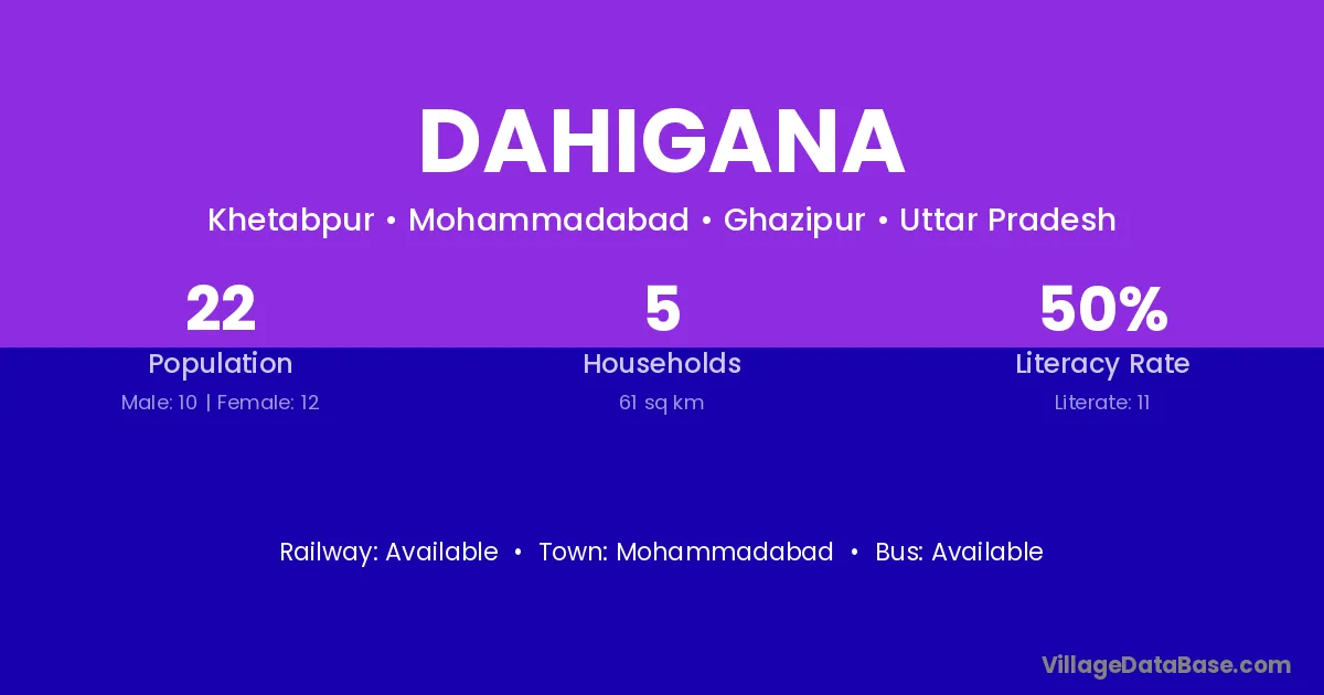 The literacy rate of Dahigana village is 55.21%. Male literacy stands at 66.67% and female literacy at 43.75%.