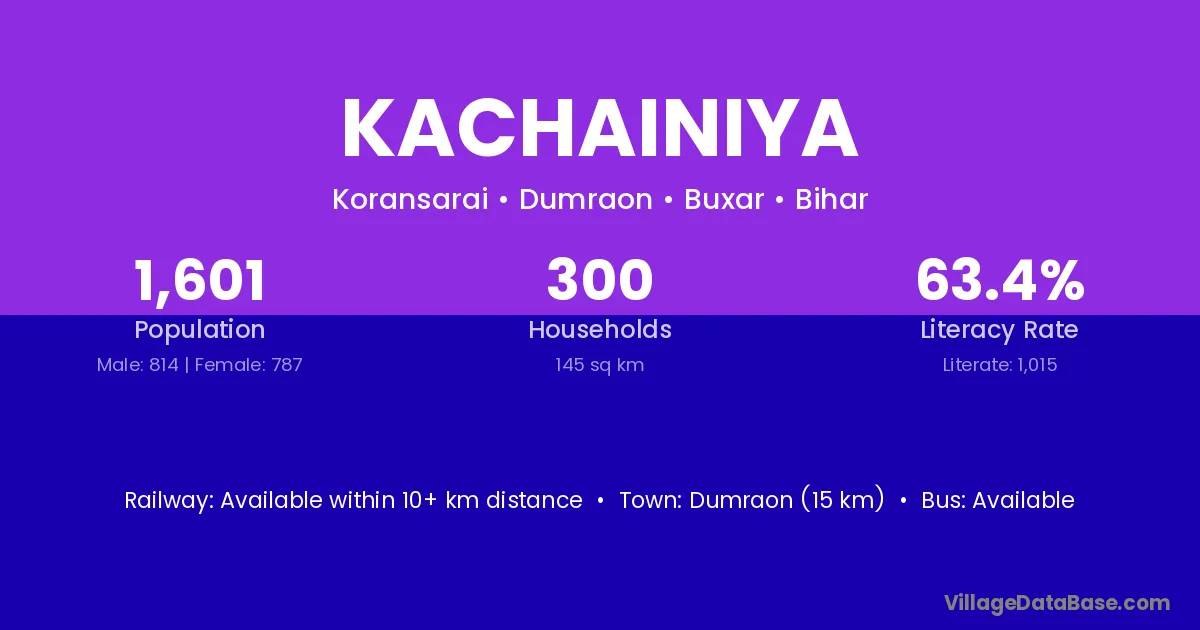 Dumraon (15 km) is the nearest town to Kachainiya village for major economic activities and is located approximately 15 km away.