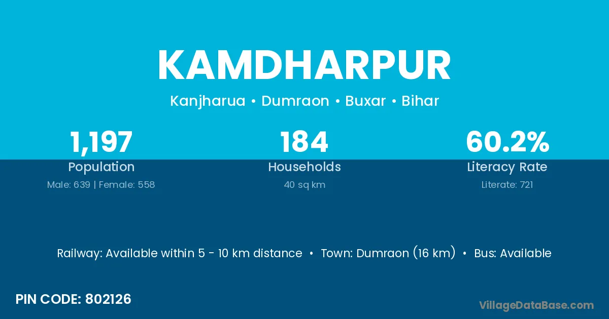 Dumraon (16 km) is the nearest town to Kamdharpur village for major economic activities and is located approximately 16 km away.