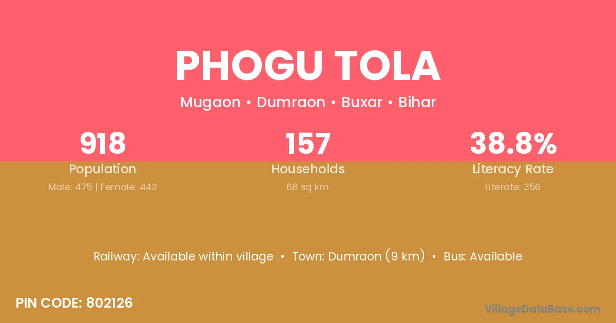 Phogu Tola village has a total population of 918 people, of which 475 are males and 443 are females.