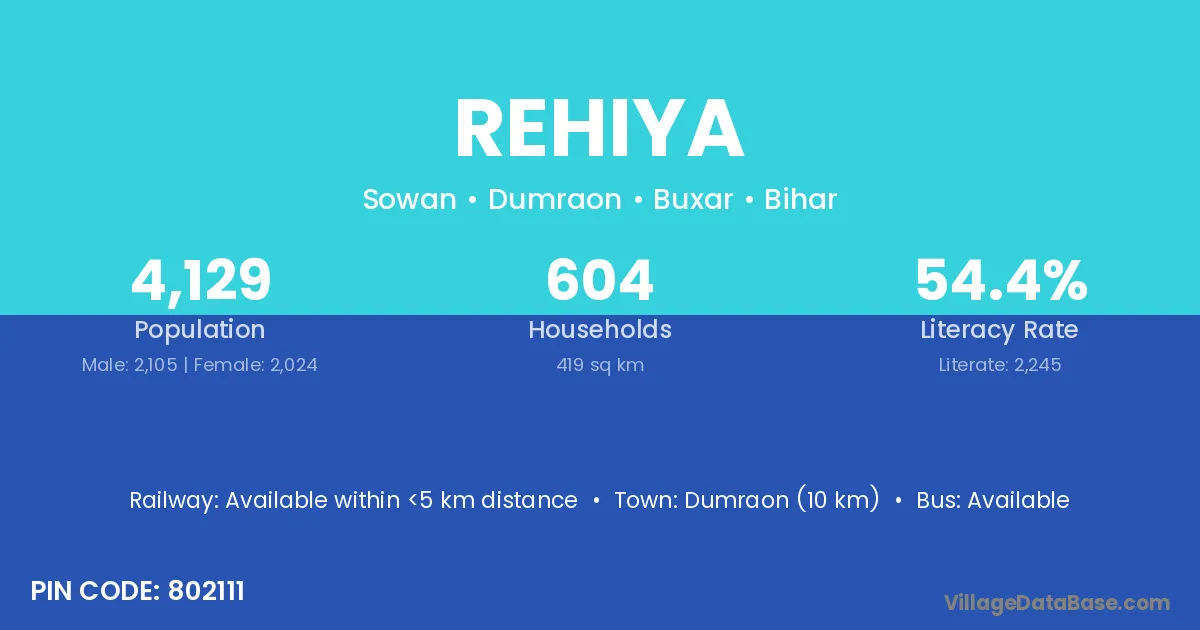 Dumraon (10 km) is the nearest town to Rehiya village for major economic activities and is located approximately 10 km away.