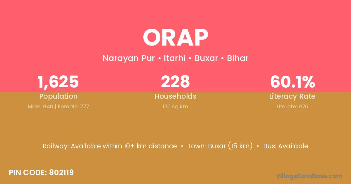 Buxar (15 km) is the nearest town to Orap village for major economic activities and is located approximately 15 km away.