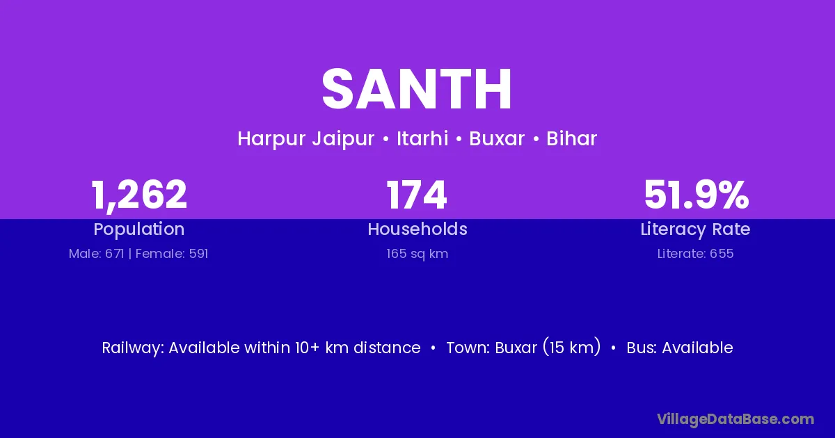 Buxar (15 km) is the nearest town to Santh village for major economic activities and is located approximately 15 km away.