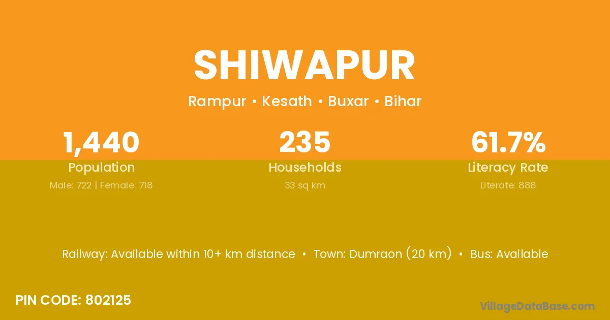 Dumraon (20 km) is the nearest town to Shiwapur village for major economic activities and is located approximately 20 km away.