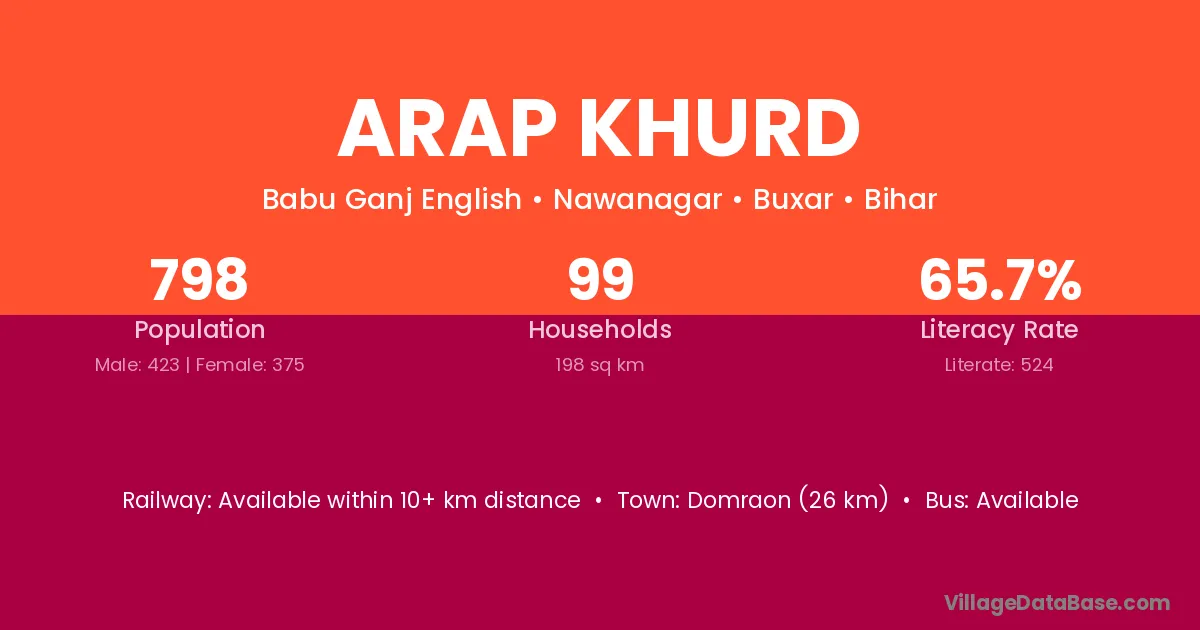 Domraon (26 km) is the nearest town to Arap Khurd village for major economic activities and is located approximately 26 km away.