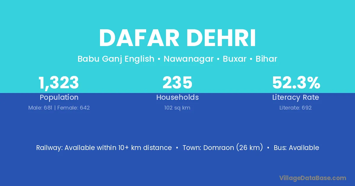 Domraon (26 km) is the nearest town to Dafar Dehri village for major economic activities and is located approximately 26 km away.