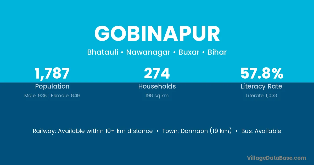 Domraon (19 km) is the nearest town to Gobinapur village for major economic activities and is located approximately 19 km away.