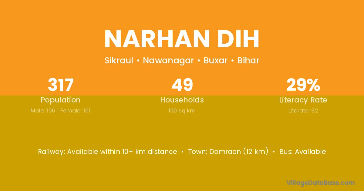 Domraon (12 km) is the nearest town to Narhan Dih village for major economic activities and is located approximately 12 km away.