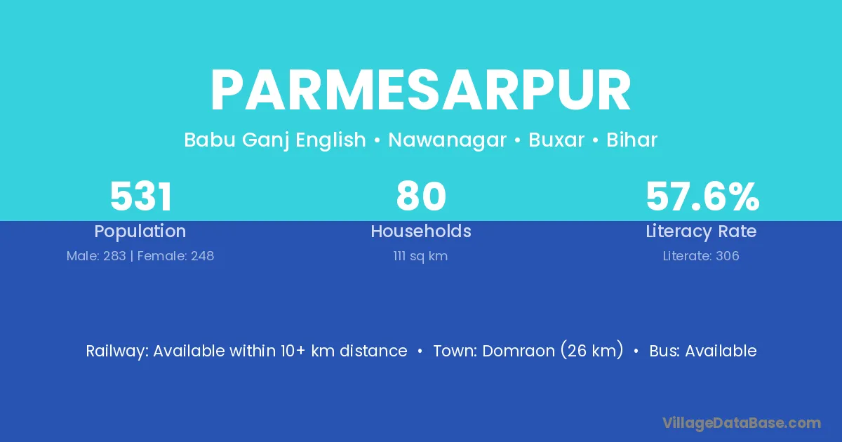 Domraon (26 km) is the nearest town to Parmesarpur village for major economic activities and is located approximately 26 km away.