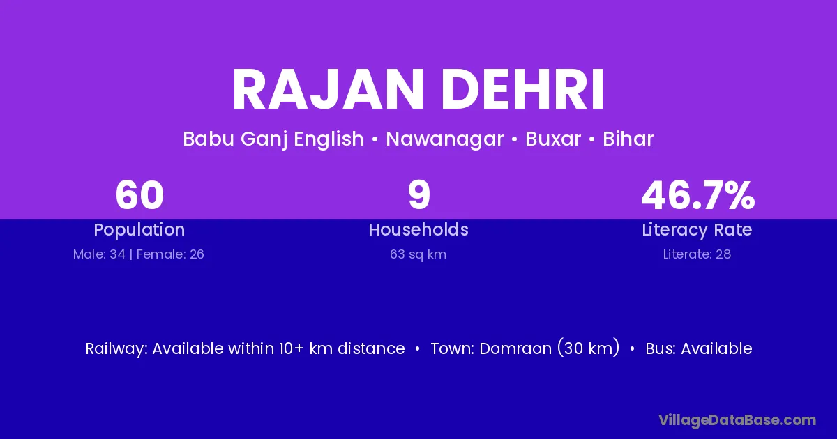 Domraon (30 km) is the nearest town to Rajan Dehri village for major economic activities and is located approximately 30 km away.