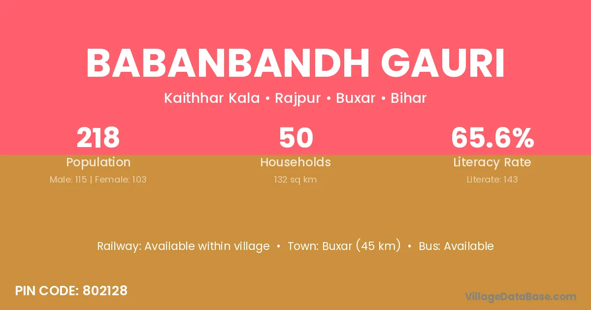 Babanbandh Gauri village has a total population of 218 people, of which 115 are males and 103 are females.