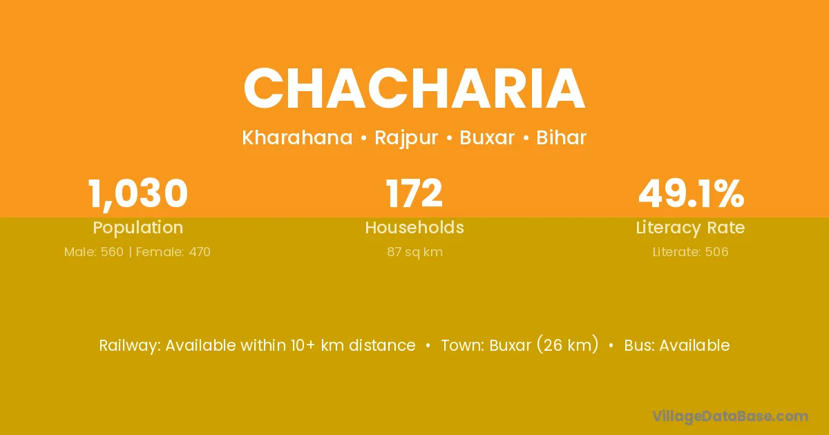 Buxar (26 km) is the nearest town to Chacharia village for major economic activities and is located approximately 26 km away.