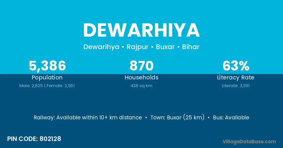 Buxar (25 km) is the nearest town to Dewarhiya village for major economic activities and is located approximately 25 km away.
