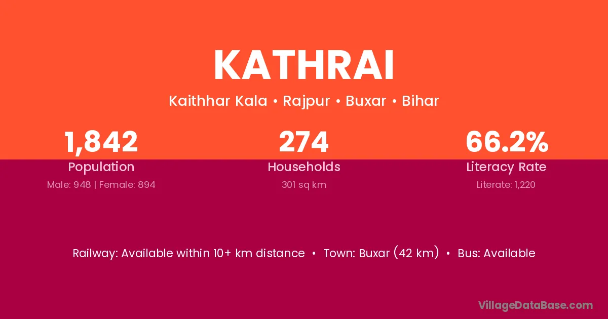 Buxar (42 km) is the nearest town to Kathrai village for major economic activities and is located approximately 42 km away.