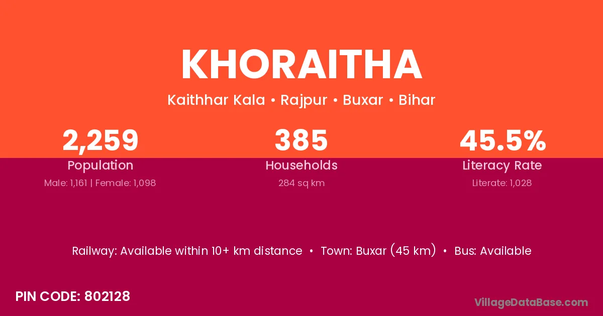 Buxar (45 km) is the nearest town to Khoraitha village for major economic activities and is located approximately 45 km away.