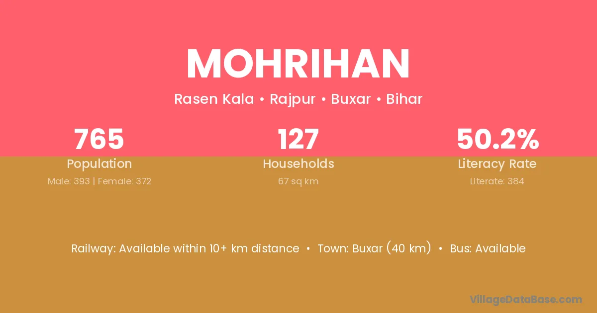 Buxar (40 km) is the nearest town to Mohrihan village for major economic activities and is located approximately 40 km away.