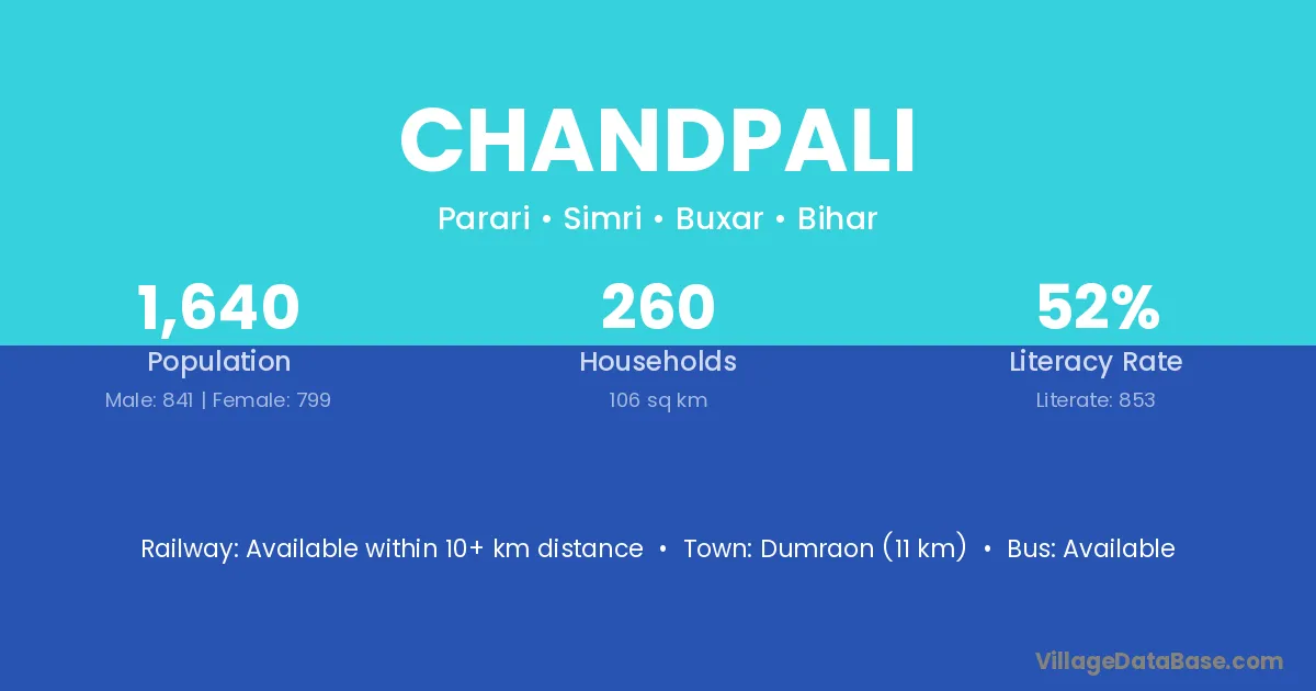 Dumraon (11 km) is the nearest town to Chandpali village for major economic activities and is located approximately 11 km away.