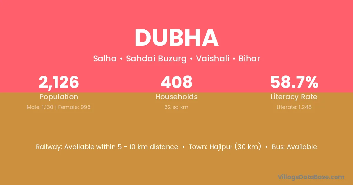 Dumraon (22 km) is the nearest town to Dubha village for major economic activities and is located approximately 22 km away.