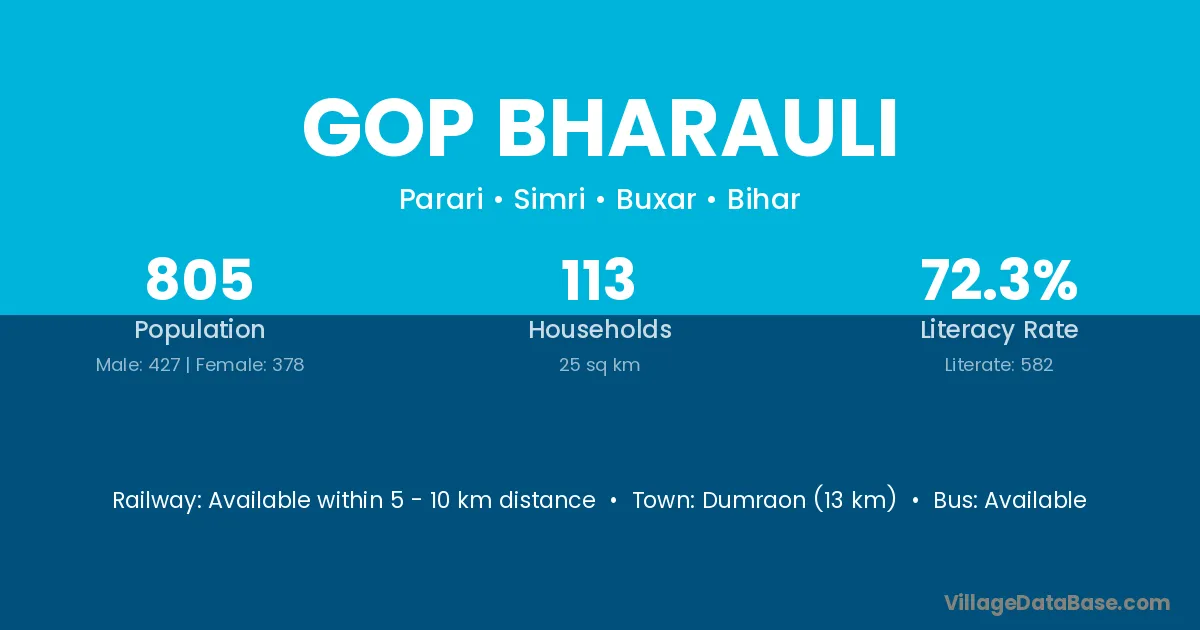 Dumraon (13 km) is the nearest town to Gop Bharauli village for major economic activities and is located approximately 13 km away.