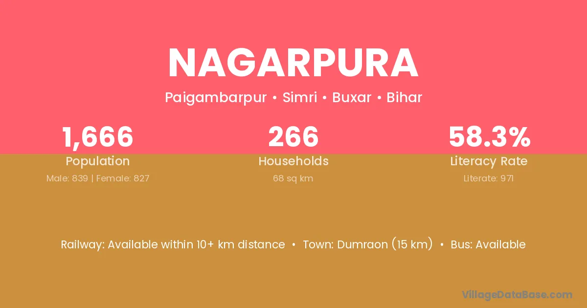 Dumraon (15 km) is the nearest town to Nagarpura village for major economic activities and is located approximately 15 km away.