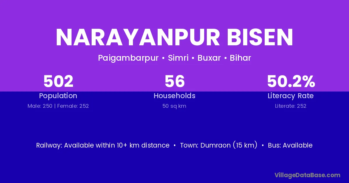 Dumraon (15 km) is the nearest town to Narayanpur Bisen village for major economic activities and is located approximately 15 km away.