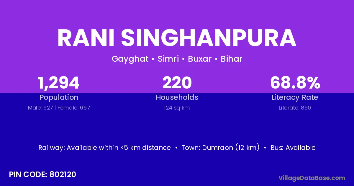 Dumraon (12 km) is the nearest town to Rani Singhanpura village for major economic activities and is located approximately 12 km away.