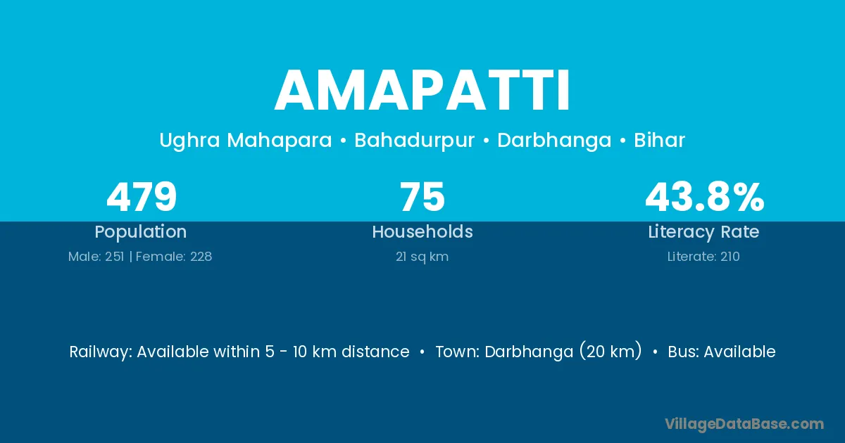 Amapatti village has a total population of 479 people, of which 251 are males and 228 are females.