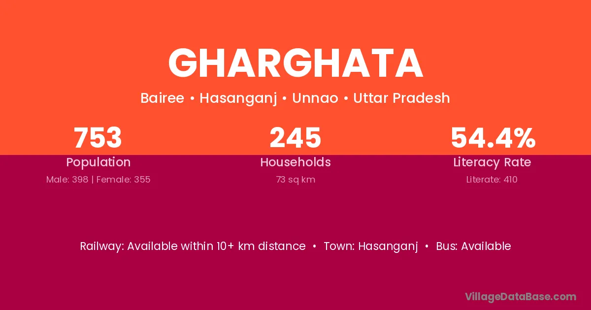 The literacy rate of Gharghata village is 36.59%. Male literacy stands at 47.70% and female literacy at 24.06%.