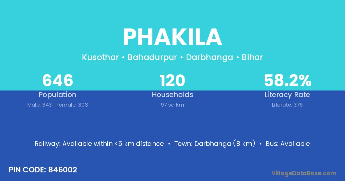 Darbhanga (8 km) is the nearest town to Phakila village for major economic activities and is located approximately 8 km away.