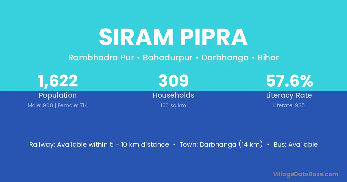Darbhanga (14 km) is the nearest town to Siram Pipra village for major economic activities and is located approximately 14 km away.