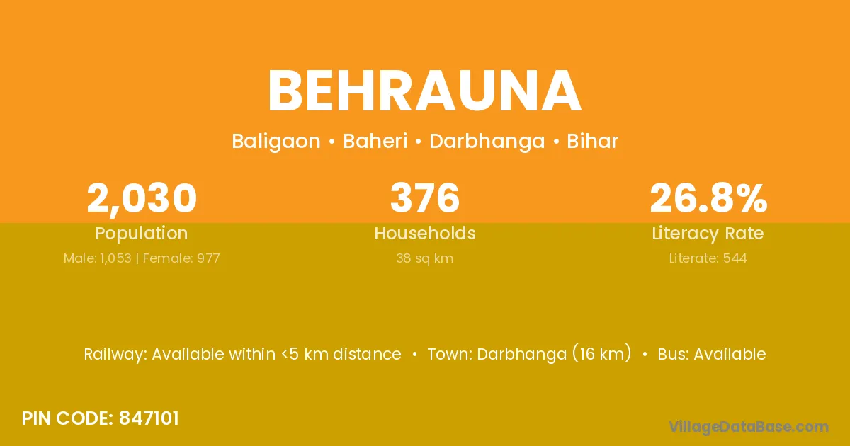 Darbhanga (16 km) is the nearest town to Behrauna village for major economic activities and is located approximately 16 km away.