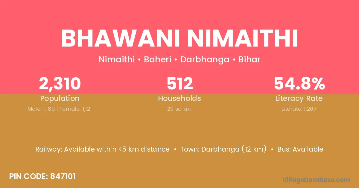 Bhawani Nimaithi village has a total population of 2,310 people, of which 1,189 are males and 1,121 are females.