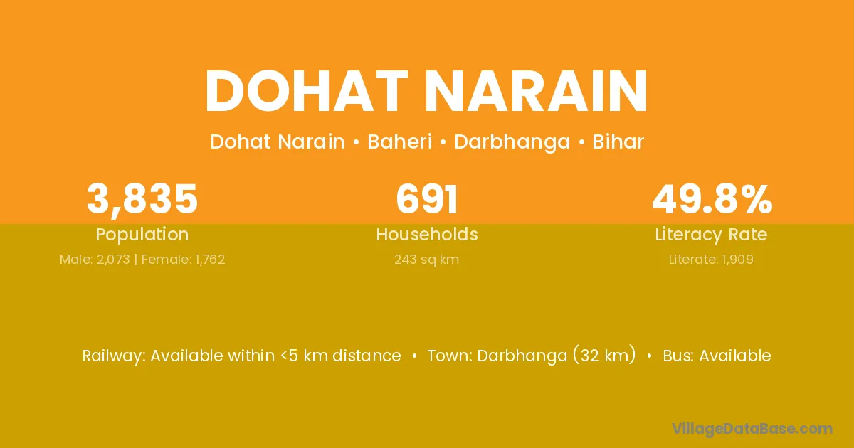 Darbhanga (32 km) is the nearest town to Dohat Narain village for major economic activities and is located approximately 32 km away.