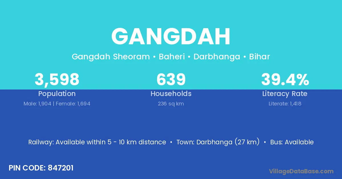 Darbhanga (27 km) is the nearest town to Gangdah village for major economic activities and is located approximately 27 km away.