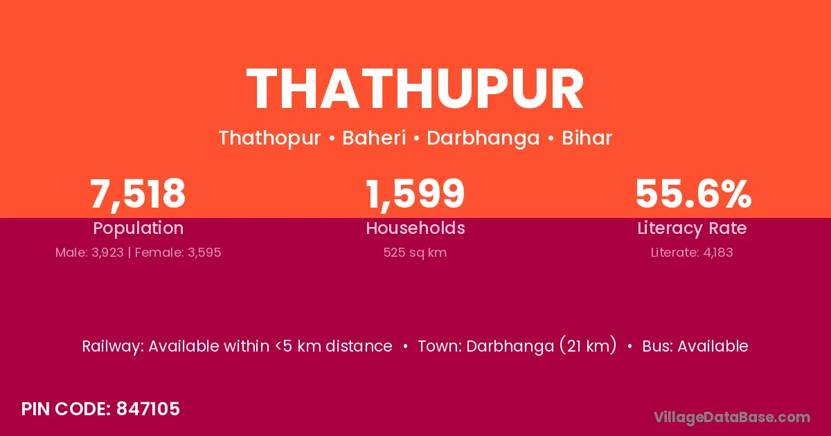 Darbhanga (21 km) is the nearest town to Thathupur village for major economic activities and is located approximately 21 km away.
