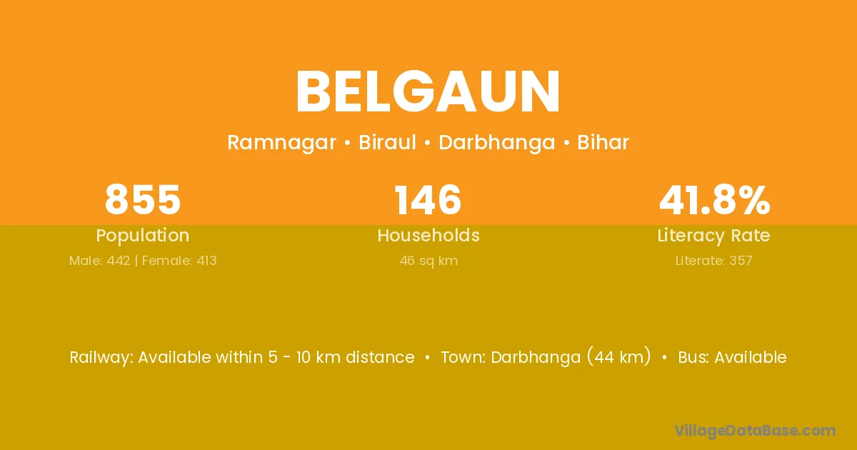 Darbhanga (44 km) is the nearest town to Belgaun village for major economic activities and is located approximately 44 km away.