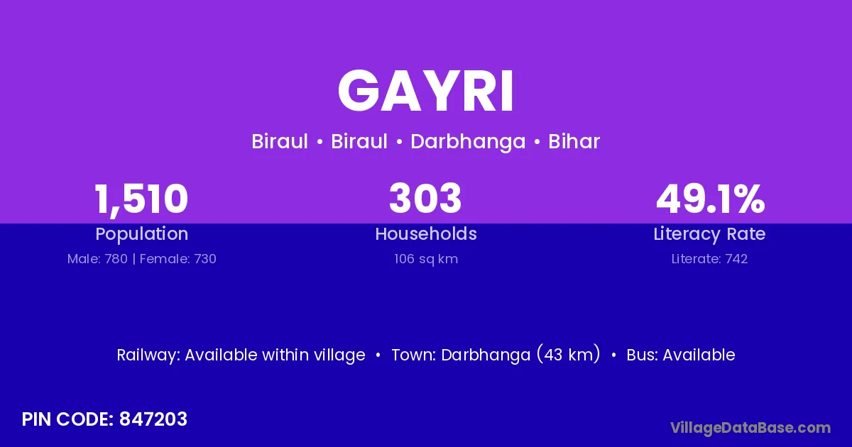 Darbhanga (43 km) is the nearest town to Gayri village for major economic activities and is located approximately 43 km away.