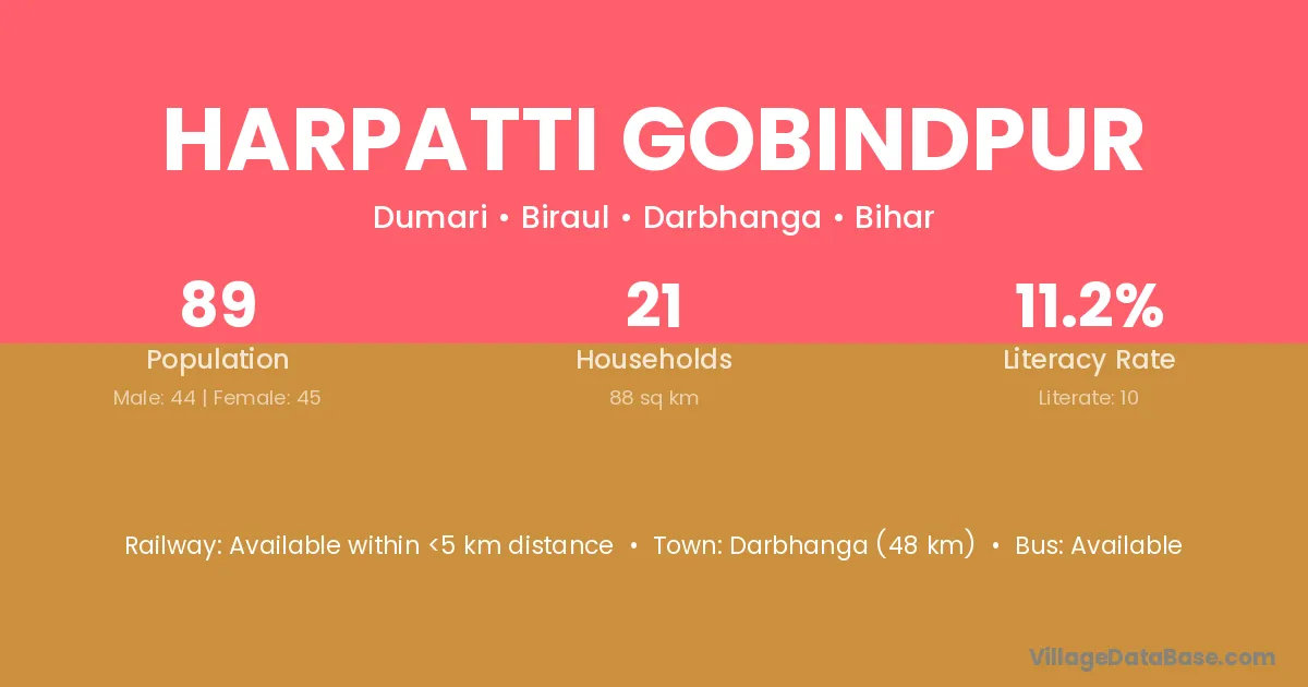 Harpatti Gobindpur village has a total population of 89 people, of which 44 are males and 45 are females.