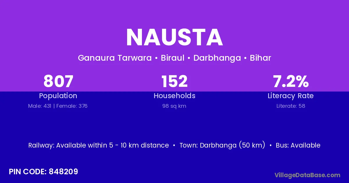 Darbhanga (50 km) is the nearest town to Nausta village for major economic activities and is located approximately 50 km away.