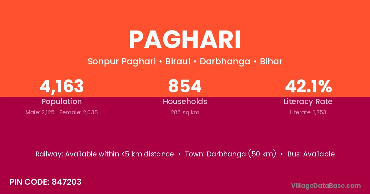Darbhanga (50 km) is the nearest town to Paghari village for major economic activities and is located approximately 50 km away.