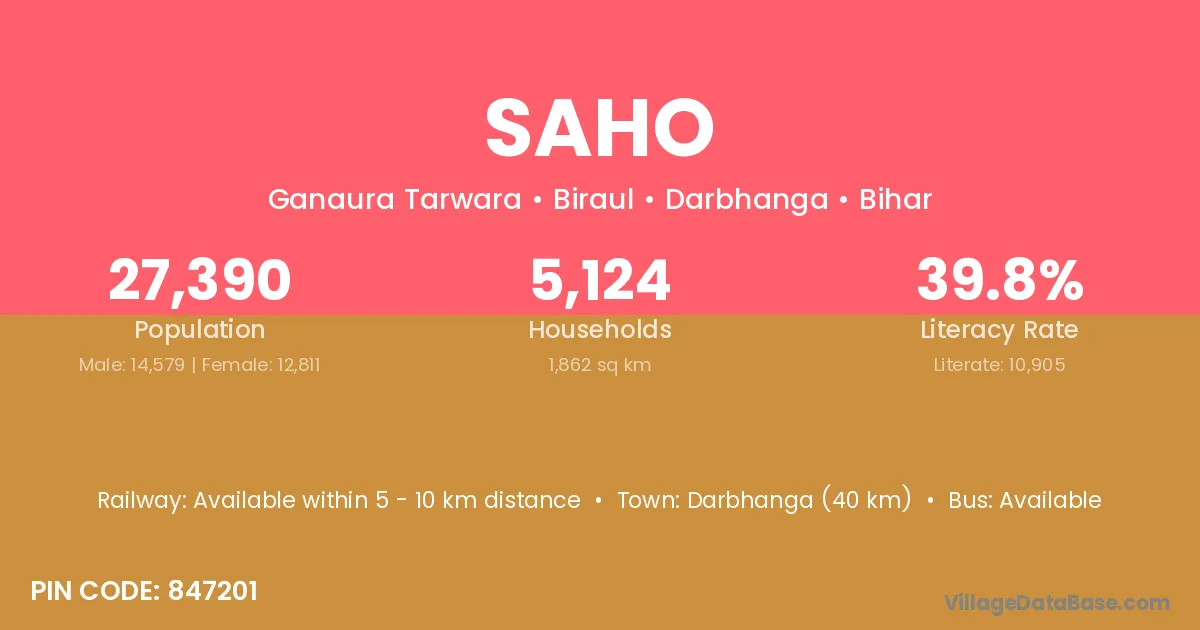 Darbhanga (40 km) is the nearest town to Saho village for major economic activities and is located approximately 40 km away.