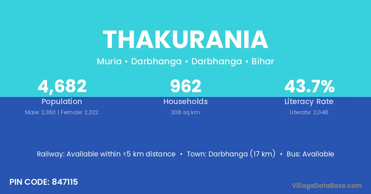 Darbhanga (17 km) is the nearest town to Thakurania village for major economic activities and is located approximately 17 km away.