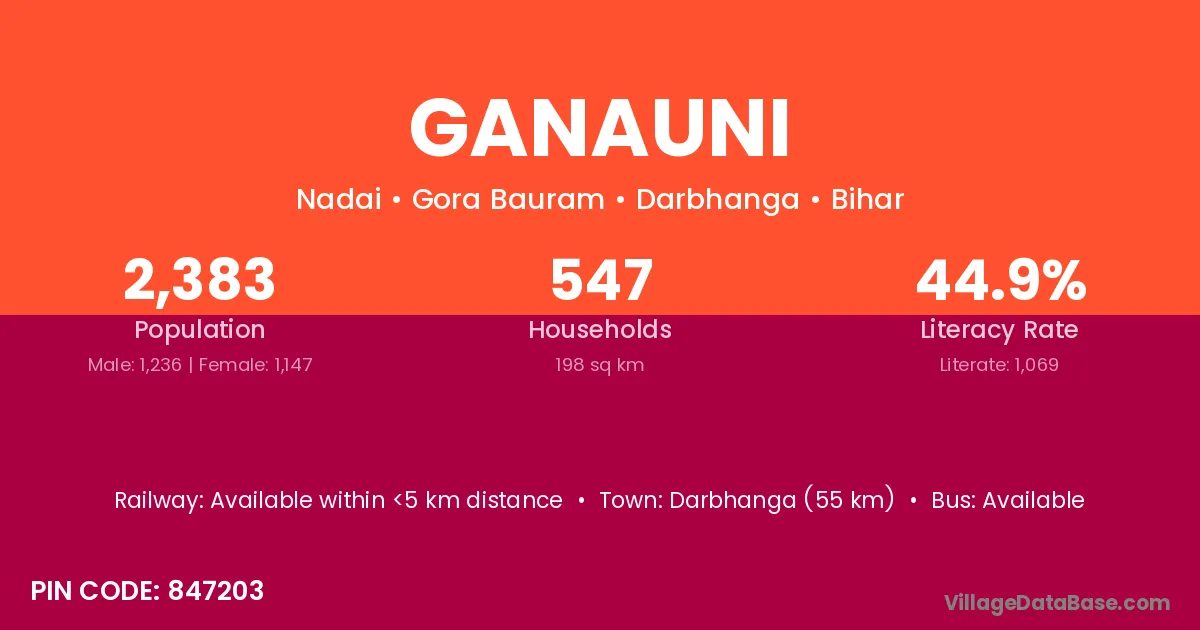 Darbhanga (55 km) is the nearest town to Ganauni village for major economic activities and is located approximately 55 km away.