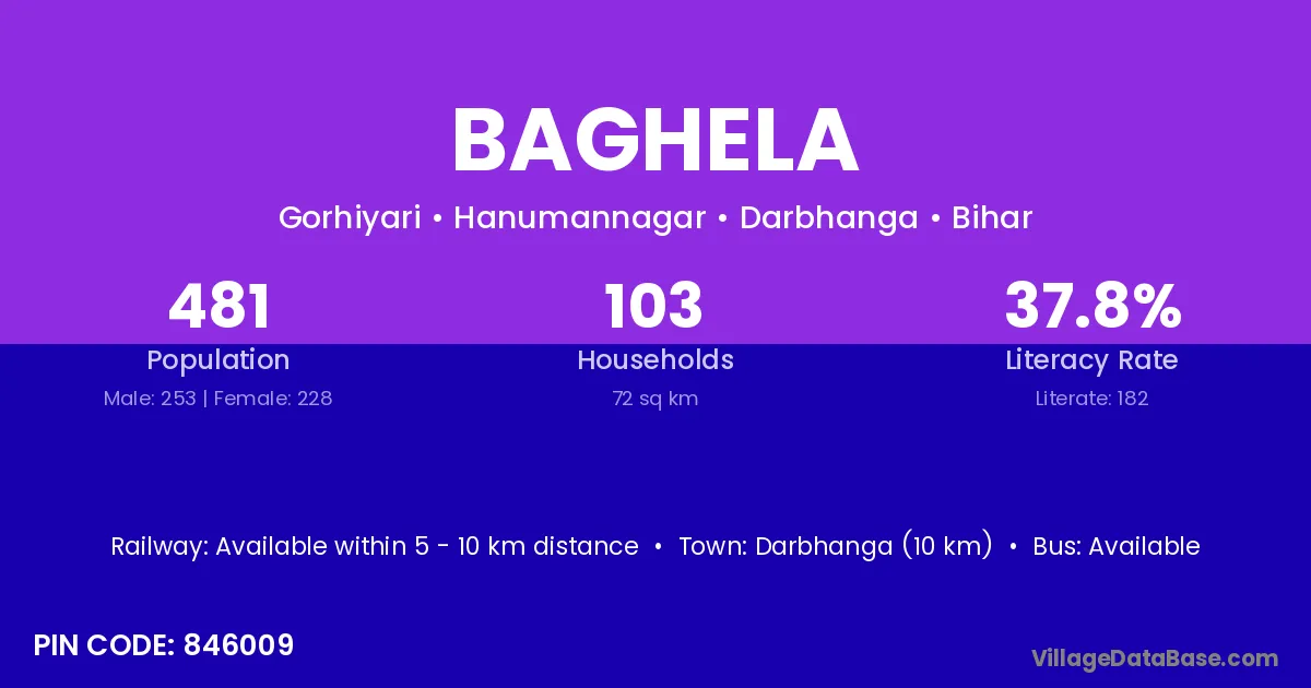 Darbhanga (10 km) is the nearest town to Baghela village for major economic activities and is located approximately 10 km away.