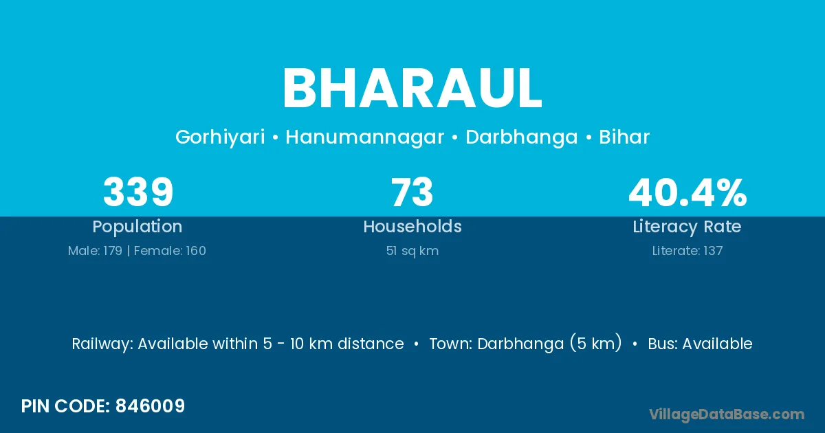 Darbhanga (5 km) is the nearest town to Bharaul village for major economic activities and is located approximately 5 km away.