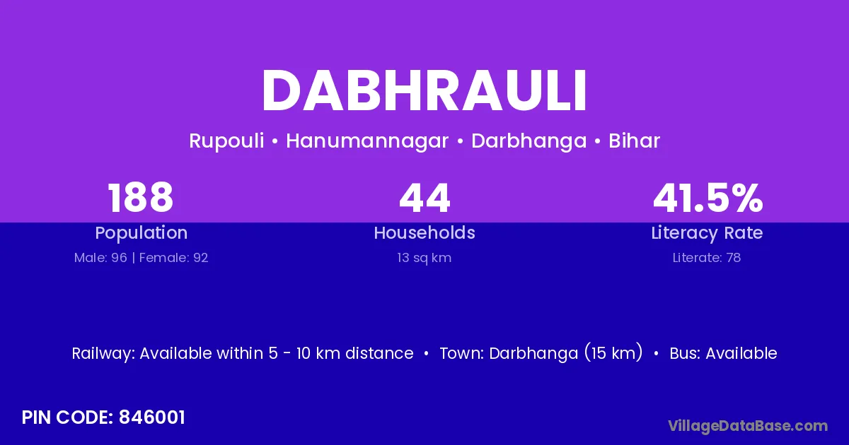 Darbhanga (15 km) is the nearest town to Dabhrauli village for major economic activities and is located approximately 15 km away.