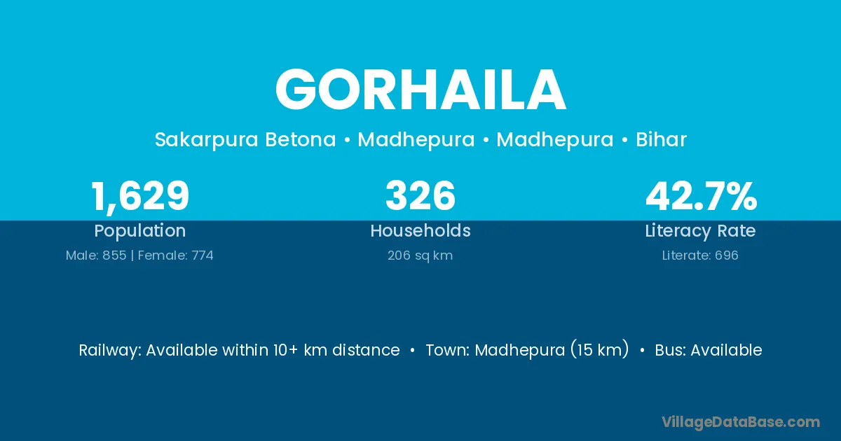 Darbhanga (14 km) is the nearest town to Gorhaila village for major economic activities and is located approximately 14 km away.