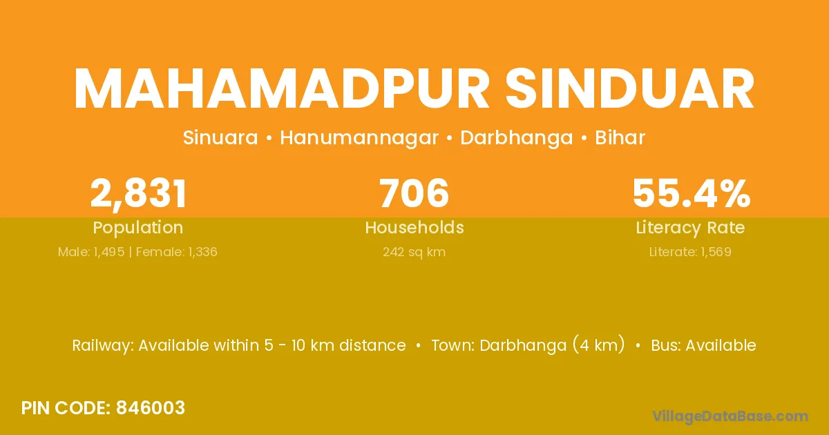 Darbhanga (4 km) is the nearest town to Mahamadpur Sinduar village for major economic activities and is located approximately 4 km away.