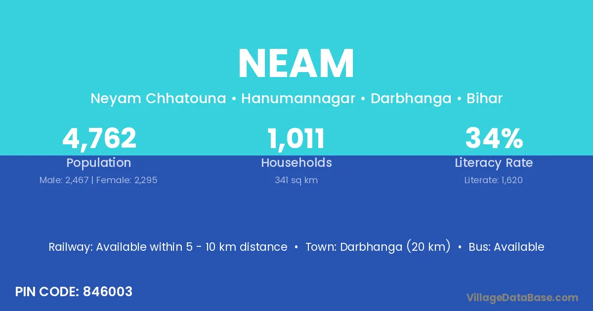 Darbhanga (20 km) is the nearest town to Neam village for major economic activities and is located approximately 20 km away.